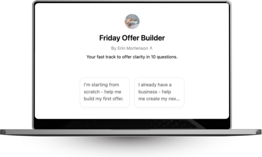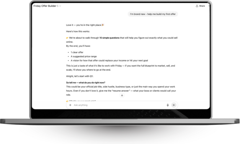 Friday Offer Builder is your AI powered tool that walks you through 10 powerful questions to uncover exactly what you can sell based on your unique skills, strengths, background, and zone of genius.